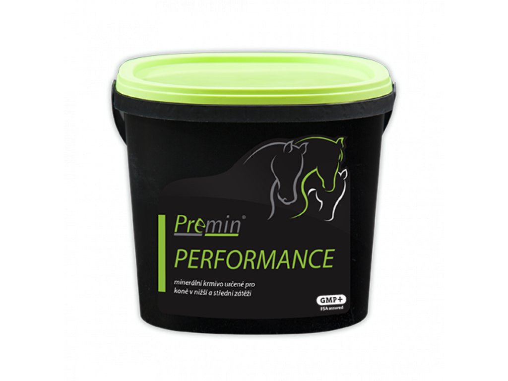 Minerální krmivo Premin® PERFORMANCE mimo jiné obsahuje dihydrogenfosforečnan vápenatý, uhličitan vápenatý, chlorid sodný, melasa řepná, pšeničná mouka krmná, oxid hořečnatý, kvasinky, zchutňovadlo.