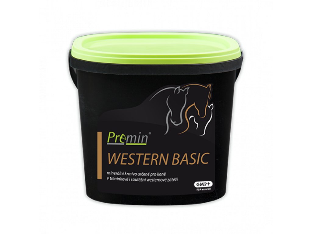 Premin® Western Basic je minerální krmivo určené pro koně v zájmovém chovu v tréninkové i soutěžní westernové zátěži. Vitamínovým a minerálním složením pokrývá biologickou potřebu koně a zároveň je obohaceno esenciálními aminokyselinami a organicky vázanými prvky, potřebnými pro správnou funkci organismu v požadované zátěži. Minerální krmivo obsahuje L-karnitin, který je důležitou součástí jak srdeční, tak kosterní svaloviny, pomáhá štěpení tuků a stává se tak nezanedbatelným nosičem energie. Doplněk kvasinek zlepšuje trávení vlákniny, čímž i minerální látky z krmiva jsou lépe využívány.